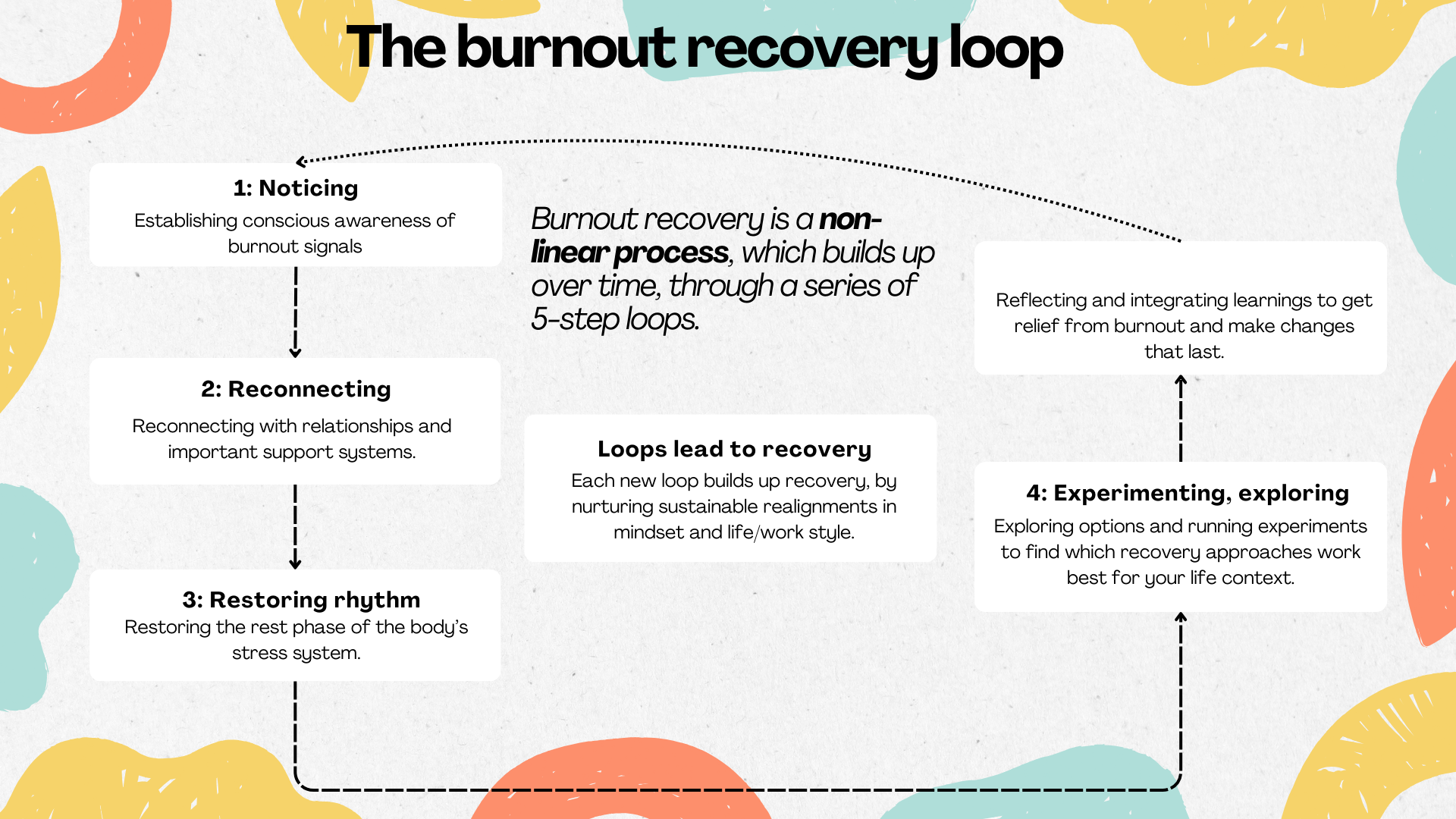 In order to provide new insights to people who know they are burned out and want to get insights next into how to recover from burnout – while also acknowledging that it is not a linear path – the team behind Bonsai has developed a new model specifically for mapping the process of burnout recovery, called The 5-Step Loop for Burnout Recovery.